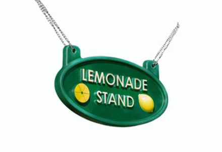 Encourage your little entrepreneur with our Lemonade Sign. This eye-catching sign will ensure that kids will be lined up around the block for a taste of the fun! The sign can be added to a swing set or attached to any piece of wood using the included eye hooks and chains. The green plastic sign is weather-resistant with raised letters and lemon graphics. Simply refreshing!