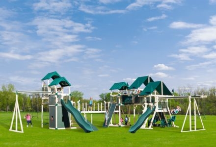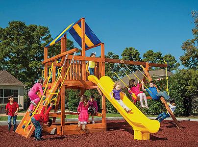 The enormous KRC Extreme is Swing Kingdom’s largest playset. It is big enough to accommodate the entire neighborhood, and then some. Three double towers, three slides, two rock walls, two cargo nets, flat step ladders, jungle bars, a twelve foot ramp, tower tunnel and bridge are just the beginning of what makes the extreme an amazing place to play. It also boasts a plastic glider, trapeze, three belt swings, baby swing, horse rider, hammock swing, and a three-rope tire swing. Adding to the fun are the sandbox, bubble panel, tic-tac-toe panel, ship’s wheel, two binoculars, a steering wheel, telescope, periscope, clubhouse, and picnic table. The extreme is activity filled fun for kids of all ages. Dimensions 44’w x 44’d x 16’h Weight 5,641 lbs. Tower (2) 5′ x 5′ decks, 5′ x 9′ double, 5′ x 9′ double with jungle bar tower Deck Height 5′, 7′, 9′ Access flat step ladder with hand rail Roof (2) 5′ x 10′ canvas with flags, (3) gable roofs Climber 5′ rock wall with rope, 7′ rock wall with rope, cargo net Connector 6’6″ tower tunnel, 12′ bridge with rope Slide 14′ avalanche slide, 10′ avalanche slide, turbo twister slide Swing Beam 4 position climber, 3 position single high beam Swings plastic glider, trapeze, (3) belt swings, baby swing, horse rider, hammock swing, three-rope tire swing Anchors 4 Accessories bubble panel, tic-tac-toe panel, ship’s wheel, (2) binoculars, fire pole, steering wheel, telescope, periscope, 5’x 5′ club house, 4′ x 5′ picnic table Border∗ 200′ landscape timber Mulch∗ 9 ton rubber mulch 50 cubic yds. wood mulch Warranty: Limited Lifetime, 20-Year and 5-Year Warranty Subject to ordinary residential use and proper installation by a certified SK installer. Swing Kingdom warrants to the original purchaser at the original installation address, that the structural components of the playground systems, such as the PVC plastic lumber and wood components are covered by a 20-year warranty. In addition all canopies, slides, metal components, swings and accessories are warranted for 5 years from date of original purchase. Swing Kingdom’s products are not warranted as being suitable for a particular purpose. The suitability of the product is for the purchaser to determine. This warranty does not cover normal wear and tear, failure to properly maintain the product, or damage resulting from misuse or abuse of the product, additionally any acts of nature such as lightning, storms, hurricanes, tornados, earthquakes or any extreme weather conditions. Also any alteration, addition or relocation of the product will void this warranty. Swing Kingdom reserves the right to examine photographs and/or physical evidence of the product claimed to be defective, and to recover product prior to any warranty claims. All products returned for inspection must be sent freight prepaid. In the event of a defect covered by these warranties, Swing Kingdom will remedy the defect within a reasonable time. The remedy will consist of repair or replacement of the defective piece unless it is not practical. Then Swing Kingdom will reimburse the original purchaser for the value of the defective piece. (All freight cost of replacement parts are not cover under warranty and will be the purchaser responsibility to cover) Adult supervision is recommended while enjoying your play system. For safety and comfort reasons, Swing Kingdom reserves the right to make design & construction changes without notice.