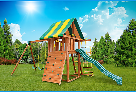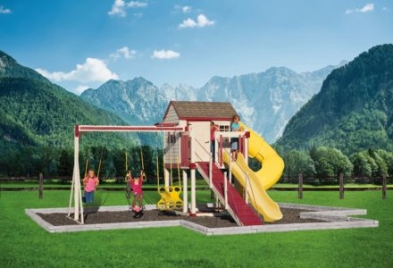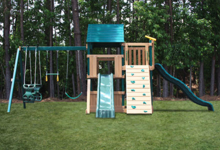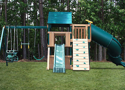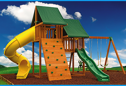This all-ages Mountain Climber playset has something to entertain even the youngest members of your crew. The rubber infant swing will keep the little ones safe and secure, while the big kids scale the five foot rock wall and zip down the avalanche slide. This swing set also comes standard with a belt swing, trapeze, and three-rope tire swing. Dimensions 16’w x 18’d x 12’6″h Weight 1,162 lbs. Tower 5′ x 5′ deck Deck Height 5′ Access flat step ladder with hand rail Roof 5′ x 10′ canvas with flags Climber 5′ rock wall with rope, cargo net Slide 10′ avalanche slide Swing Beam 3 position climber, 1 position extension arm Swings belt swing, trapeze, rubber infant swing, three-rope tire swing Anchors 2 Accessories steering wheel, telescope Border∗ 96′ landscape timber Mulch∗ 2 ton rubber mulch 12 cubic yds. wood mulch. Warranty: Limited Lifetime, 20-Year and 5-Year Warranty Subject to ordinary residential use and proper installation by a certified SK installer. Swing Kingdom warrants to the original purchaser at the original installation address, that the structural components of the playground systems, such as the PVC plastic lumber and wood components are covered by a 20-year warranty. In addition all canopies, slides, metal components, swings and accessories are warranted for 5 years from date of original purchase. Swing Kingdom’s products are not warranted as being suitable for a particular purpose. The suitability of the product is for the purchaser to determine. This warranty does not cover normal wear and tear, failure to properly maintain the product, or damage resulting from misuse or abuse of the product, additionally any acts of nature such as lightning, storms, hurricanes, tornados, earthquakes or any extreme weather conditions. Also any alteration, addition or relocation of the product will void this warranty. Swing Kingdom reserves the right to examine photographs and/or physical evidence of the product claimed to be defective, and to recover product prior to any warranty claims. All products returned for inspection must be sent freight prepaid. In the event of a defect covered by these warranties, Swing Kingdom will remedy the defect within a reasonable time. The remedy will consist of repair or replacement of the defective piece unless it is not practical. Then Swing Kingdom will reimburse the original purchaser for the value of the defective piece. (All freight cost of replacement parts are not cover under warranty and will be the purchaser responsibility to cover) Adult supervision is recommended while enjoying your play system. For safety and comfort reasons, Swing Kingdom reserves the right to make design & construction changes without notice.