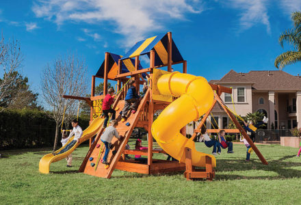 Treasure Trove Swing Set is a spot for fun in your own backyard with The Reserve! This huge swing set has it all – two covered play decks, a clatter bridge and tower – plus two slides! Imaginations will be in overdrive when they’re playing with all of the added accessories. Select from our wood roofs, classic vinyl canopies, our authentic Sunbrella® canopies, or our Malibu Wood Roof. • Wiki Wave Slide™ • Radical Ride 7’ Tube Slide™ • Clatter Bridge & Tower • Rock Wall with Climbing Rope • Safe Entry Ladder • Deluxe Rope Ladder • Belt Swing • Trapeze Swing • Tandem Swing designed for 1 or 2 riders • Built-In Picnic Table • Sandbox • Bonus Sandbox under Tower • Tic-Tac-Toe Panel • Steering Wheel • Play Telescope • Deluxe Green Vinyl Canopy covering Platform and Tower • 4×4 Maintenance-free Timber Shield™ Posts & Main Beams • 4×6 3-Position Maintenance-free Timber Shield™ Swing Beam • Patented One-Piece A-Frame Bracket • Available in Cedar with a beautiful Amber Finish • 15 Year Limited Warranty on Lumber, 1 Year on Accessories **FOR RESIDENTIAL USE ONLY**