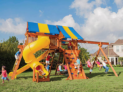 The Rocky Mountain Climber playset builds upon a solid foundation of fun. This playground offers the standard slide and deck combo, then multiplies that by three and adds a bubble panel, binoculars, ship’s wheel, three-rope tire swing, belt swings and, trapeze. This playset is the embodiment of a healthy and active lifestyle. Dimensions 30’w x 23’d x 14′ h Weight 2,492 lbs. Tower (3) 5′ x 5′ decks Deck Height 7′, 5′, 7′ Access flat step ladder with hand rail Roof (3) 5′ x 10′ canvas with flags Climber 5′ rock wall with rope, cargo net Slide 14′ avalanche slide, 10′ avalanche slide, 7′ turbo twister slide, 7′ sidewinder slide Swing Beam 3 position single high beam Swings three-rope tire swing, (2) belt swings, trapeze Anchors 2 Accessories ship’s wheel, binoculars, bubble panel Border∗ 134′ landscape timber Mulch∗ 5 ton rubber mulch 22 cubic yds. wood mulch. Warranty: Limited Lifetime, 20-Year and 5-Year Warranty Subject to ordinary residential use and proper installation by a certified SK installer. Swing Kingdom warrants to the original purchaser at the original installation address, that the structural components of the playground systems, such as the PVC plastic lumber and wood components are covered by a 20-year warranty. In addition all canopies, slides, metal components, swings and accessories are warranted for 5 years from date of original purchase. Swing Kingdom’s products are not warranted as being suitable for a particular purpose. The suitability of the product is for the purchaser to determine. This warranty does not cover normal wear and tear, failure to properly maintain the product, or damage resulting from misuse or abuse of the product, additionally any acts of nature such as lightning, storms, hurricanes, tornados, earthquakes or any extreme weather conditions. Also any alteration, addition or relocation of the product will void this warranty. Swing Kingdom reserves the right to examine photographs and/or physical evidence of the product claimed to be defective, and to recover product prior to any warranty claims. All products returned for inspection must be sent freight prepaid. In the event of a defect covered by these warranties, Swing Kingdom will remedy the defect within a reasonable time. The remedy will consist of repair or replacement of the defective piece unless it is not practical. Then Swing Kingdom will reimburse the original purchaser for the value of the defective piece. (All freight cost of replacement parts are not cover under warranty and will be the purchaser responsibility to cover) Adult supervision is recommended while enjoying your play system. For safety and comfort reasons, Swing Kingdom reserves the right to make design & construction changes without notice.