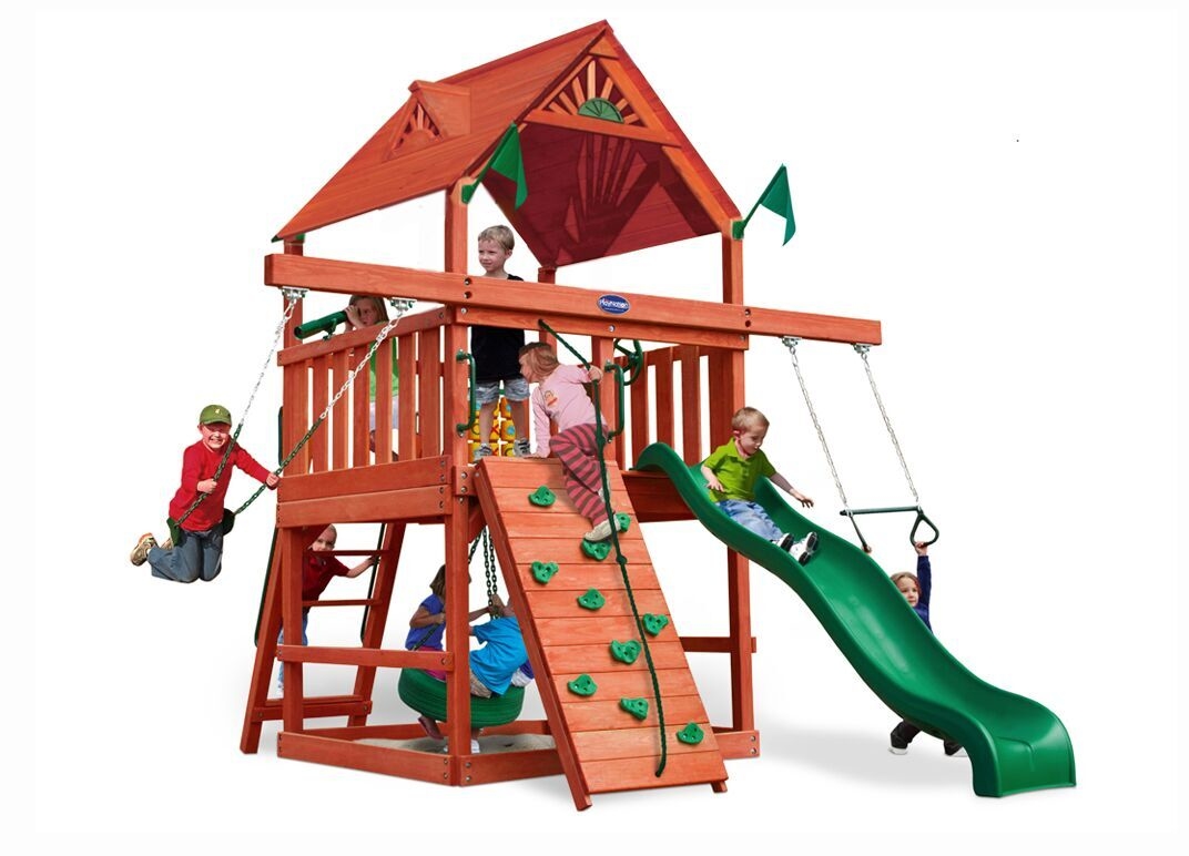 The fort on this Mountain Climber playset includes a 25 square foot deck, an excellent place to spy through the telescope or to hunker down for a backyard adventure. A rock wall climber, cargo net, ten foot wave slide, trapeze, three-rope tire swing, and belt swing round out this playground. Dimensions 10’w x 18’d x 12’6″h Weight 956 lbs. Tower 5′ x 5′ deck Deck Height 5′ Access flat step ladder with hand rail Roof 5′ x 10′ canvas with flags Climber 5′ rock wall with rope, cargo net Slide 10′ wave slide Swing Beam 2 position extension arm Swings trapeze, three-rope tire swing, belt swing Anchors 2 Accessories steering wheel, telescope Border∗ 84′ landscape timber Mulch∗ 1 ton rubber mulch 7 cubic yds. wood mulch. Warranty: Limited Lifetime, 20-Year and 5-Year Warranty Subject to ordinary residential use and proper installation by a certified SK installer. Swing Kingdom warrants to the original purchaser at the original installation address, that the structural components of the playground systems, such as the PVC plastic lumber and wood components are covered by a 20-year warranty. In addition all canopies, slides, metal components, swings and accessories are warranted for 5 years from date of original purchase. Swing Kingdom’s products are not warranted as being suitable for a particular purpose. The suitability of the product is for the purchaser to determine. This warranty does not cover normal wear and tear, failure to properly maintain the product, or damage resulting from misuse or abuse of the product, additionally any acts of nature such as lightning, storms, hurricanes, tornados, earthquakes or any extreme weather conditions. Also any alteration, addition or relocation of the product will void this warranty. Swing Kingdom reserves the right to examine photographs and/or physical evidence of the product claimed to be defective, and to recover product prior to any warranty claims. All products returned for inspection must be sent freight prepaid. In the event of a defect covered by these warranties, Swing Kingdom will remedy the defect within a reasonable time. The remedy will consist of repair or replacement of the defective piece unless it is not practical. Then Swing Kingdom will reimburse the original purchaser for the value of the defective piece. (All freight cost of replacement parts are not cover under warranty and will be the purchaser responsibility to cover) Adult supervision is recommended while enjoying your play system. For safety and comfort reasons, Swing Kingdom reserves the right to make design & construction changes without notice.