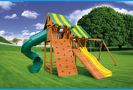 The Mega Mountain Climber playset will encourage your child to dream big. With three slides, two decks, and a four position swing beam, the only problem with this playset may be deciding what to play with first. This swing set includes a steering wheel, telescope, five foot rock wall, and cargo net. Dimensions 24’w x 23’d x 14’h Weight 1,932 lbs. Tower (2) 5′ x 5′ decks Deck Height 5′, 7′ Access flat step ladder with hand rail Roof (2) 5′ x 10′ canvas with flags Climber 5′ rock wall with rope, cargo net Slide 14′ avalanche slide, 10′ avalanche slide, turbo twister slide Swing Beam 4 position climber Swings plastic glider, rubber infant swing, trapeze, belt swing, three-rope tire swing, hammock swing Anchors 2 Accessories steering wheel, telescope Border∗ 122′ landscape timber Mulch∗ 4 ton rubber mulch 20 cubic yds. wood mulch. Warranty: Limited Lifetime, 20-Year and 5-Year Warranty Subject to ordinary residential use and proper installation by a certified SK installer. Swing Kingdom warrants to the original purchaser at the original installation address, that the structural components of the playground systems, such as the PVC plastic lumber and wood components are covered by a 20-year warranty. In addition all canopies, slides, metal components, swings and accessories are warranted for 5 years from date of original purchase. Swing Kingdom’s products are not warranted as being suitable for a particular purpose. The suitability of the product is for the purchaser to determine. This warranty does not cover normal wear and tear, failure to properly maintain the product, or damage resulting from misuse or abuse of the product, additionally any acts of nature such as lightning, storms, hurricanes, tornados, earthquakes or any extreme weather conditions. Also any alteration, addition or relocation of the product will void this warranty. Swing Kingdom reserves the right to examine photographs and/or physical evidence of the product claimed to be defective, and to recover product prior to any warranty claims. All products returned for inspection must be sent freight prepaid. In the event of a defect covered by these warranties, Swing Kingdom will remedy the defect within a reasonable time. The remedy will consist of repair or replacement of the defective piece unless it is not practical. Then Swing Kingdom will reimburse the original purchaser for the value of the defective piece. (All freight cost of replacement parts are not cover under warranty and will be the purchaser responsibility to cover) Adult supervision is recommended while enjoying your play system. For safety and comfort reasons, Swing Kingdom reserves the right to make design & construction changes without notice.