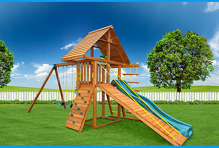 The SK-3 Mountain Climber playset proves that going up is only half the fun. The other half is going down the ten foot avalanche slide. It will zip your little mountaineer back to base camp again and again. This playset comes standard with a belt swing, trapeze, baby swing, and three-rope tire swing. A steering wheel, telescope round out the fun. Dimensions 19’w x 12’d x 11’h Weight 789 lbs. Tower 3′ x 5′ deck Deck Height 5′ Access flat step ladder with hand rail Roof 3′ x 8′ canvas with flags Climber 5′ rock wall with rope Slide 10′ avalanche slide Swing Beam 2 position single beam, 1 side extension arm Swings belt swing, trapeze, baby swing, three-rope tire swing Anchors 4 Accessories steering wheel, telescope Border∗ 92′ landscape timber Mulch∗ 2 ton rubber mulch 9 cubic yds. wood mulch. Warranty: Limited Lifetime, 20-Year and 5-Year Warranty Subject to ordinary residential use and proper installation by a certified SK installer. Swing Kingdom warrants to the original purchaser at the original installation address, that the structural components of the playground systems, such as the PVC plastic lumber and wood components are covered by a 20-year warranty. In addition all canopies, slides, metal components, swings and accessories are warranted for 5 years from date of original purchase. Swing Kingdom’s products are not warranted as being suitable for a particular purpose. The suitability of the product is for the purchaser to determine. This warranty does not cover normal wear and tear, failure to properly maintain the product, or damage resulting from misuse or abuse of the product, additionally any acts of nature such as lightning, storms, hurricanes, tornados, earthquakes or any extreme weather conditions. Also any alteration, addition or relocation of the product will void this warranty. Swing Kingdom reserves the right to examine photographs and/or physical evidence of the product claimed to be defective, and to recover product prior to any warranty claims. All products returned for inspection must be sent freight prepaid. In the event of a defect covered by these warranties, Swing Kingdom will remedy the defect within a reasonable time. The remedy will consist of repair or replacement of the defective piece unless it is not practical. Then Swing Kingdom will reimburse the original purchaser for the value of the defective piece. (All freight cost of replacement parts are not cover under warranty and will be the purchaser responsibility to cover) Adult supervision is recommended while enjoying your play system. For safety and comfort reasons, Swing Kingdom reserves the right to make design & construction changes without notice.