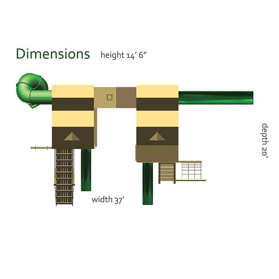 With the RL-2 Turbo Tower playset, non-stop action begins the minute they run out the door. The fun starts with the double tower, accessed by a flat step ladder or rock wall. Then, it spills into the bubble panel before racing down the turbo twister slide. A three position swing beam comes complete with a belt swing, trapeze, and daisy disk for lots of swinging variety. There is even a picnic table to make this swing set ideal for any action packed backyard. Dimensions 23’w x 18’d x 13’6″h Weight 1,735 lbs. Tower 5′ x 9′ double Deck Height 5′, 7′ Access flat step ladder with access railing Roof 5′ x 5′ vinyl with sunrise Climber 7′ rock wall with rope Slide 7′ turbo twister slide Swing Beam 3 position single beam Swings belt swing, trapeze, daisy disc Anchors 2 Accessories 5′ x 5′ picnic table, bubble panel Border∗ 110′ landscape timber Mulch∗ 2 ton rubber mulch 13 cubic yds. wood mulch Warranty: Limited Lifetime, 20-Year and 5-Year Warranty Subject to ordinary residential use and proper installation by a certified SK installer. Swing Kingdom warrants to the original purchaser at the original installation address, that the structural components of the playground systems, such as the PVC plastic lumber and wood components are covered by a 20-year warranty. In addition all canopies, slides, metal components, swings and accessories are warranted for 5 years from date of original purchase. Swing Kingdom’s products are not warranted as being suitable for a particular purpose. The suitability of the product is for the purchaser to determine. This warranty does not cover normal wear and tear, failure to properly maintain the product, or damage resulting from misuse or abuse of the product, additionally any acts of nature such as lightning, storms, hurricanes, tornados, earthquakes or any extreme weather conditions. Also any alteration, addition or relocation of the product will void this warranty. Swing Kingdom reserves the right to examine photographs and/or physical evidence of the product claimed to be defective, and to recover product prior to any warranty claims. All products returned for inspection must be sent freight prepaid. In the event of a defect covered by these warranties, Swing Kingdom will remedy the defect within a reasonable time. The remedy will consist of repair or replacement of the defective piece unless it is not practical. Then Swing Kingdom will reimburse the original purchaser for the value of the defective piece. (All freight cost of replacement parts are not cover under warranty and will be the purchaser responsibility to cover) Adult supervision is recommended while enjoying your play system. For safety and comfort reasons, Swing Kingdom reserves the right to make design & construction changes without notice.