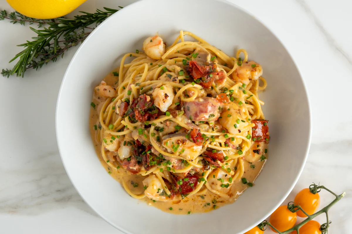 Spaghetti with sauteed shrimp tossed in a rich, creamy prawn butter & charred tomato sauce, garnished with chives